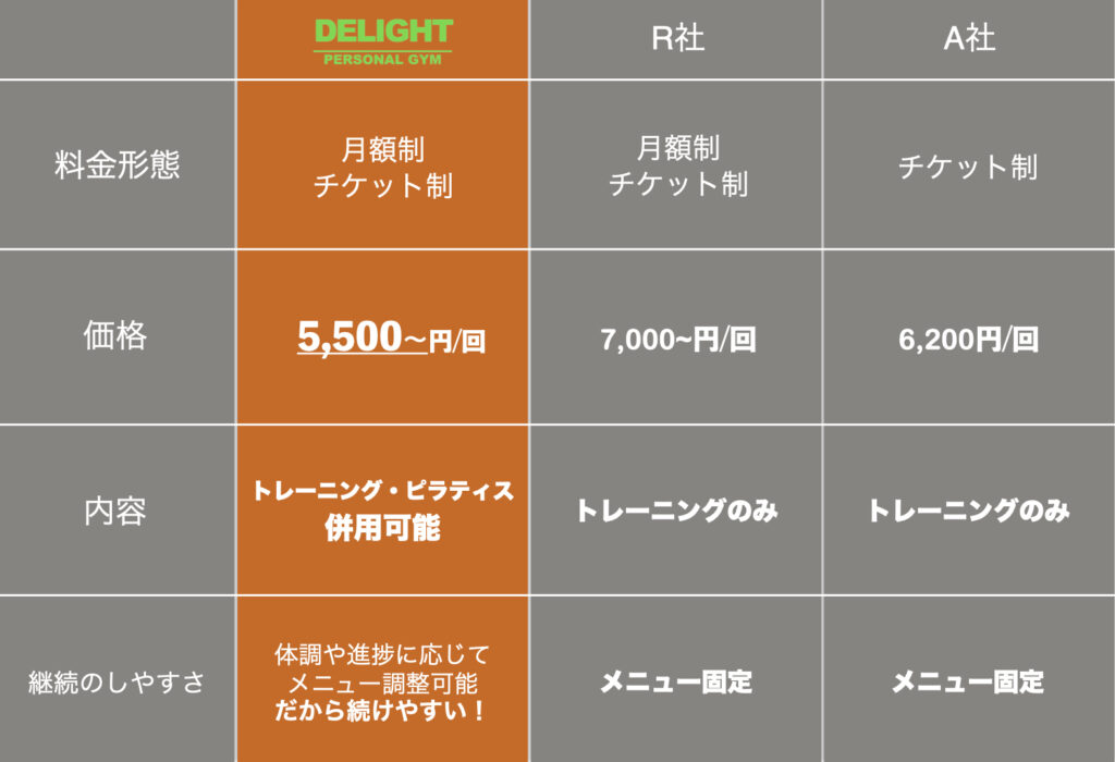 大手ジムでは高額になりがちなパーソナルトレーニングを、ディライトでは月額制・1回あたり5,500円(税込)から提供しています。