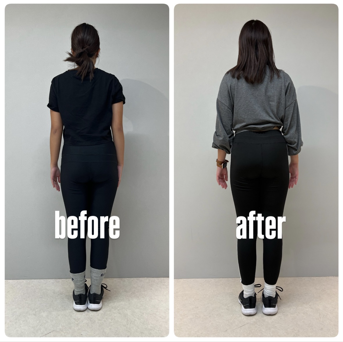 お尻サイドの丸みがついたと共にトップがついたことでハリのあるお尻に大変身しました。下半身トレーニングでよくある“前もも太くなる”問題。