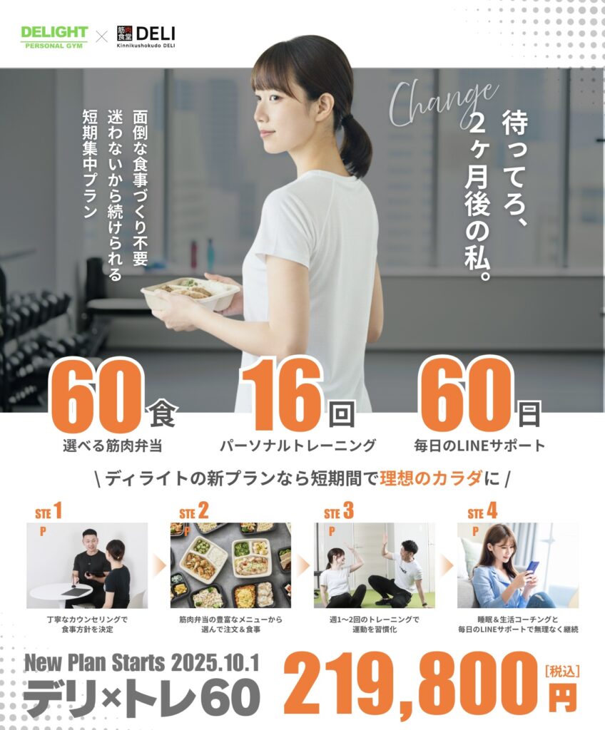 弁当60食+週1–2回の指導+毎日のアドバイスで三日坊主を防止。